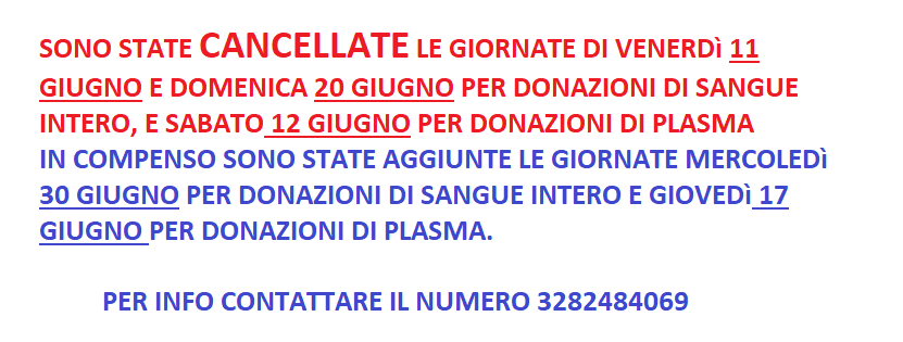 SONO STATE CANCELLATE LE GIORNATE DI DONAZIONE SANGUE INTERO VENERDì 11 GIUGNO E DOMENICA 20 GIUGNO, E LA GIORNATA DI DONZIONE PLASMA SABATO 12 GIUGNO. SONO STATE AGGIUNTE GIORNATA DI DONAZIONE SANGUE INTERO MERCOLEDI' 30 GIUGNO E GIORNATA DI DONAZIONE PLASMA GIOVEDI' 17 GIUGNO. PER INFO CONTATTARE 3282484069