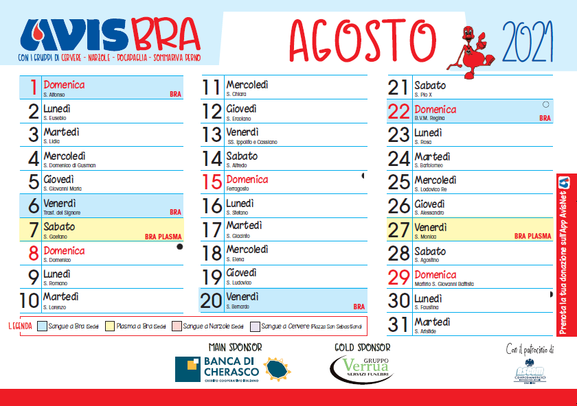 Controllate le date in cui è possibile donare nella sede di Bra e prenotate tramite APP AVISNET, oppure chiamando i numeri 0172420333 oppure 3282484069.